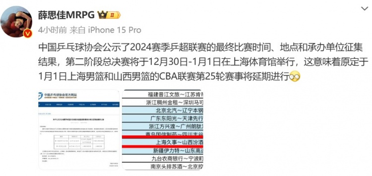 中國(guó)乒乓球協(xié)會(huì)公示了2024賽季乒超聯(lián)賽的最終比賽時(shí)間、地點(diǎn)和承辦單位征集結(jié)果,第二階段總決賽將于12月30日-1月1日在上海體育館舉行,這意味著原定于1月1日上海男籃和山西男籃的CBA聯(lián)賽第25輪賽事將延期進(jìn)行。