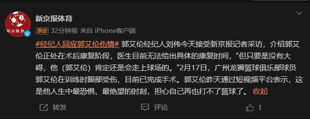2025-02-19 19:47:47經(jīng)紀(jì)人回應(yīng)郭艾倫傷勢:正處康復(fù)階段 醫(yī)生無法給出具體康復(fù)時(shí)間