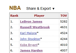 NBA失誤數(shù)榜單前6如下: