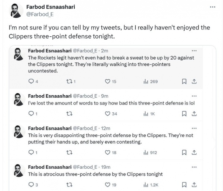 快船記者Farbod Esnaashari更推:“不確定你能否從我的推文里看出來(lái),我是真不喜歡今晚快船防守火箭三分的表現(xiàn)?!?/p>