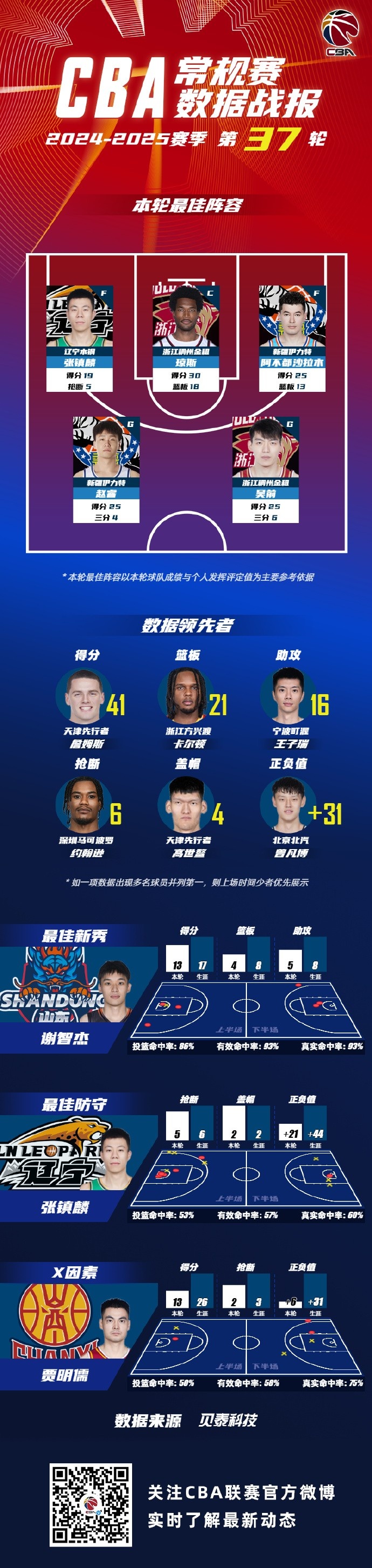 2025-03-09 14:08:51常規(guī)賽第37輪最佳陣容:張鎮(zhèn)麟&吳前&瓊斯&趙睿&阿不都