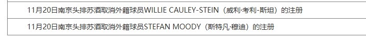 11月20日訊 今天CBA官方更新了外籍球員注冊(cè)信息表,同曦取消了威利-考利-斯坦和斯特凡-穆迪的注冊(cè)。