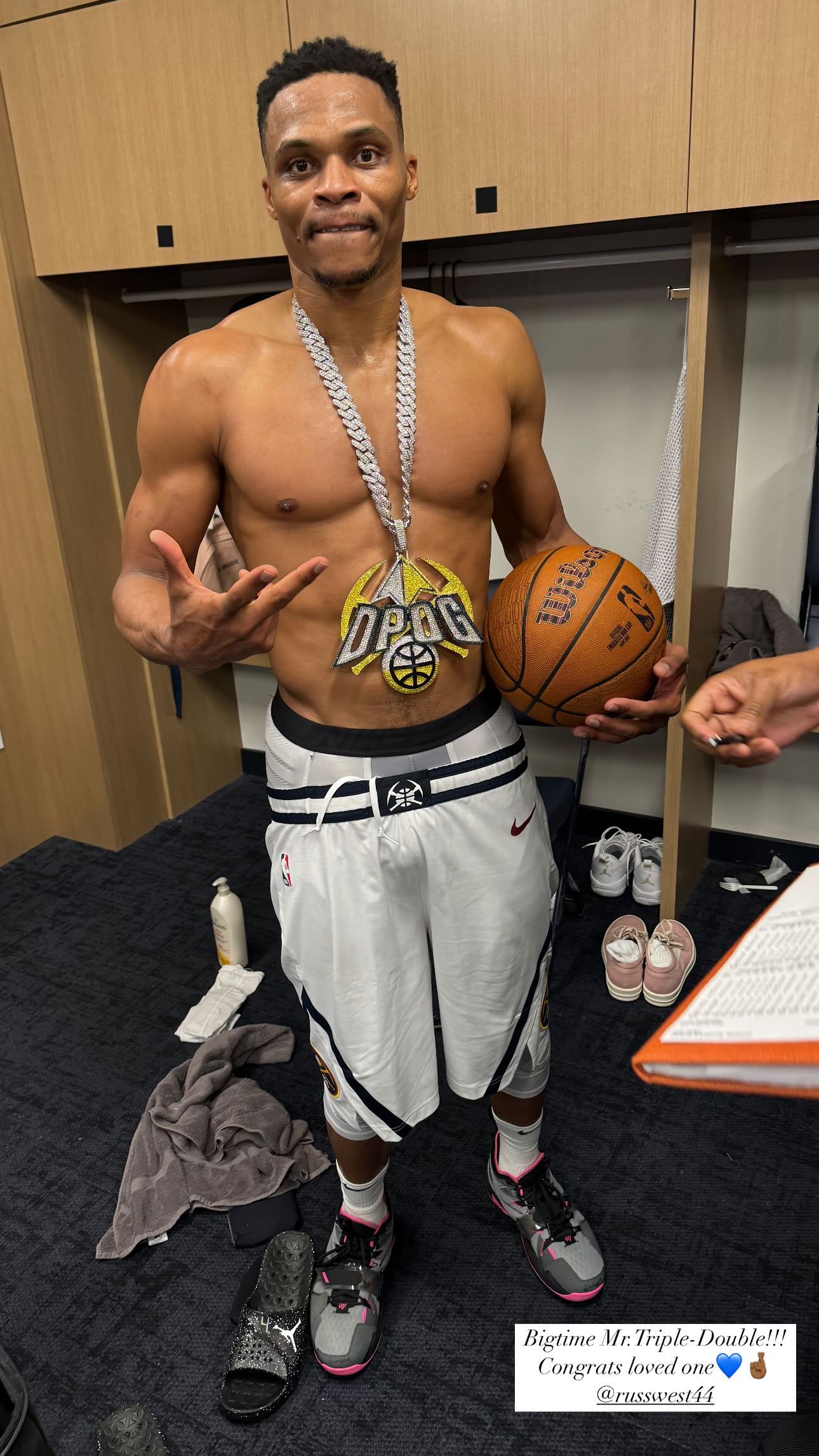 賽后,威少獲得了本場(chǎng)掘金隊(duì)內(nèi)最佳防守球員(DPOG)的大金鏈子,他還拿到了本場(chǎng)的比賽用球。