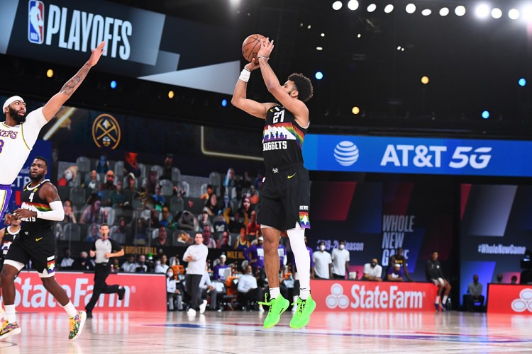 2020年9月21日,掘金103-105湖人,19投8中,25分6籃板4助攻2搶斷2蓋帽。