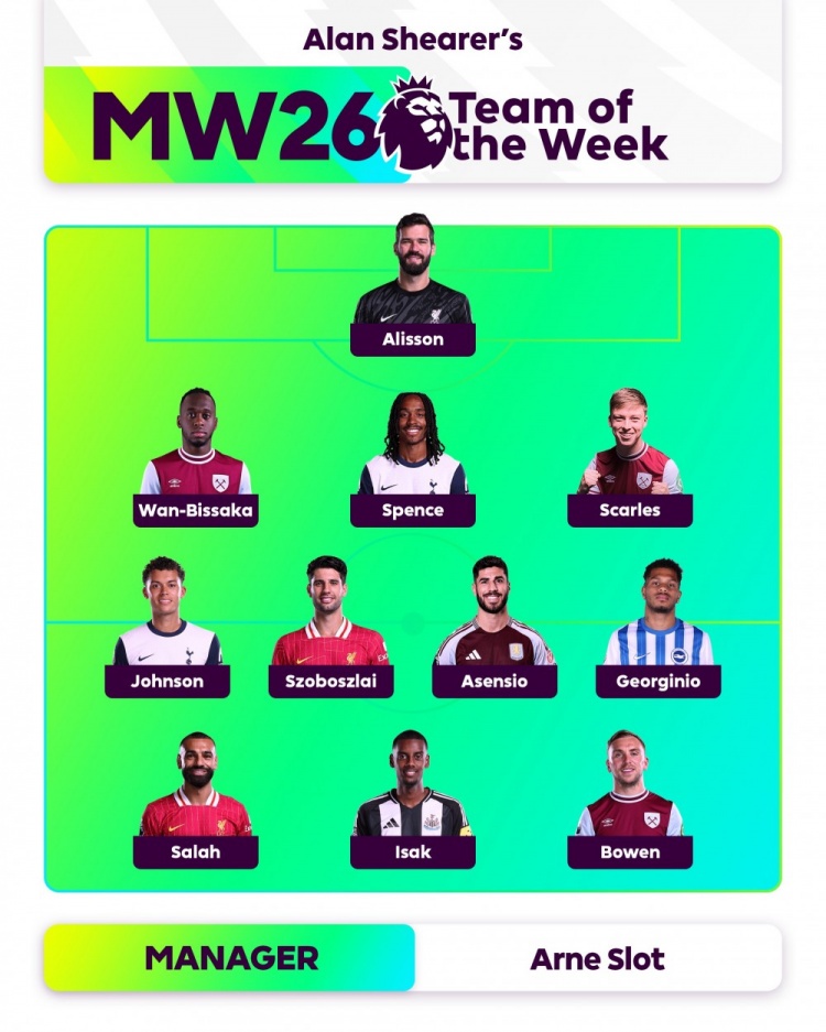 2025-02-25 00:01:05希勒評(píng)本輪英超最佳陣:薩拉赫領(lǐng)銜,伊薩克、索博、萬比薩卡入選