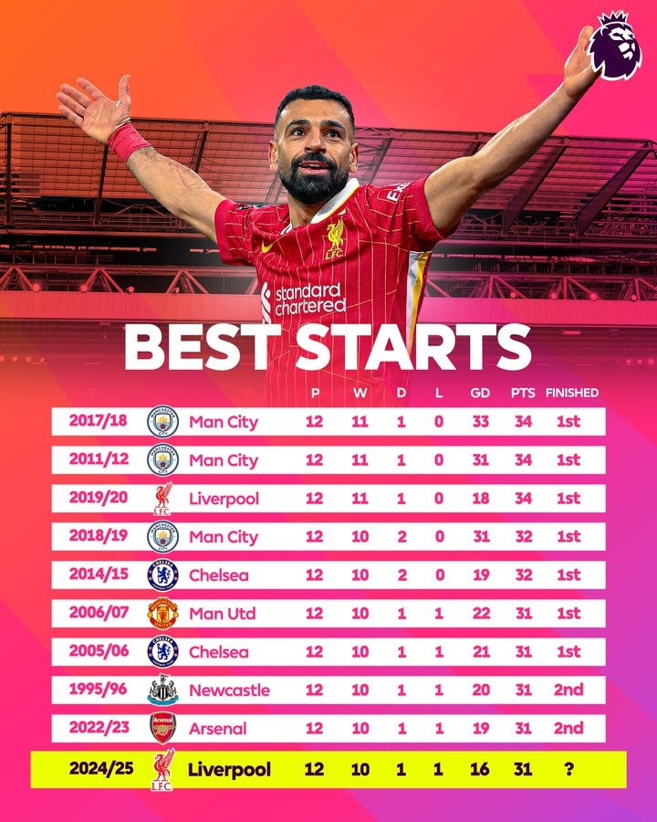 10. 2024/25賽季,利物浦:10勝1平1負(fù),31分,最終排名待定。