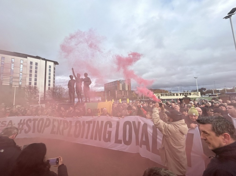 12月1日訊 在本周一,曼聯(lián)將會(huì)員門票價(jià)格提高到了66英鎊。在今天曼聯(lián)主場(chǎng)對(duì)陣埃弗頓比賽前,老特拉福德球場(chǎng)外聚集了球迷,對(duì)此表示抗議。
