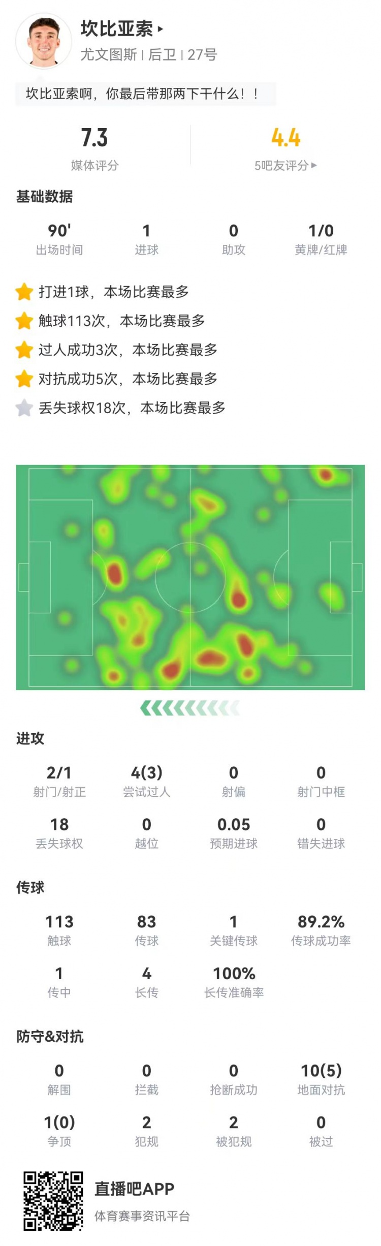 12月2日訊 尤文在本輪意甲1-1戰(zhàn)平萊切,坎比亞索本場數(shù)據(jù)如下: