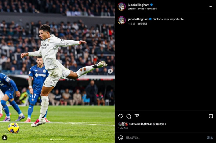12月2日訊 西甲第15輪比賽中,皇馬2-0擊敗赫塔費(fèi),貝林厄姆傳射建功。賽后,貝林更新了社媒慶祝獲勝。