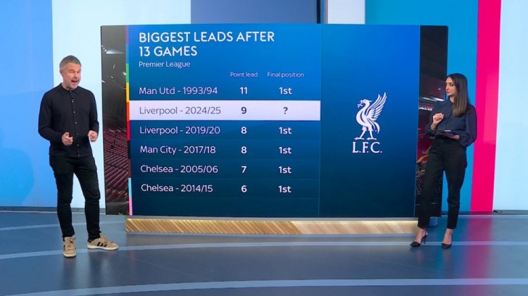 據(jù)天空體育統(tǒng)計,此前有5支球隊英超前13輪領先第二名6分或更多,這5支球隊最終都捧起了冠軍獎杯。