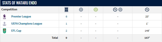 本賽季遠(yuǎn)藤航在利物浦被新帥斯洛特打入冷宮,上賽季還是球隊(duì)輪換主力的他,本賽季聯(lián)賽僅出場20分鐘,歐冠也僅上場1分鐘。