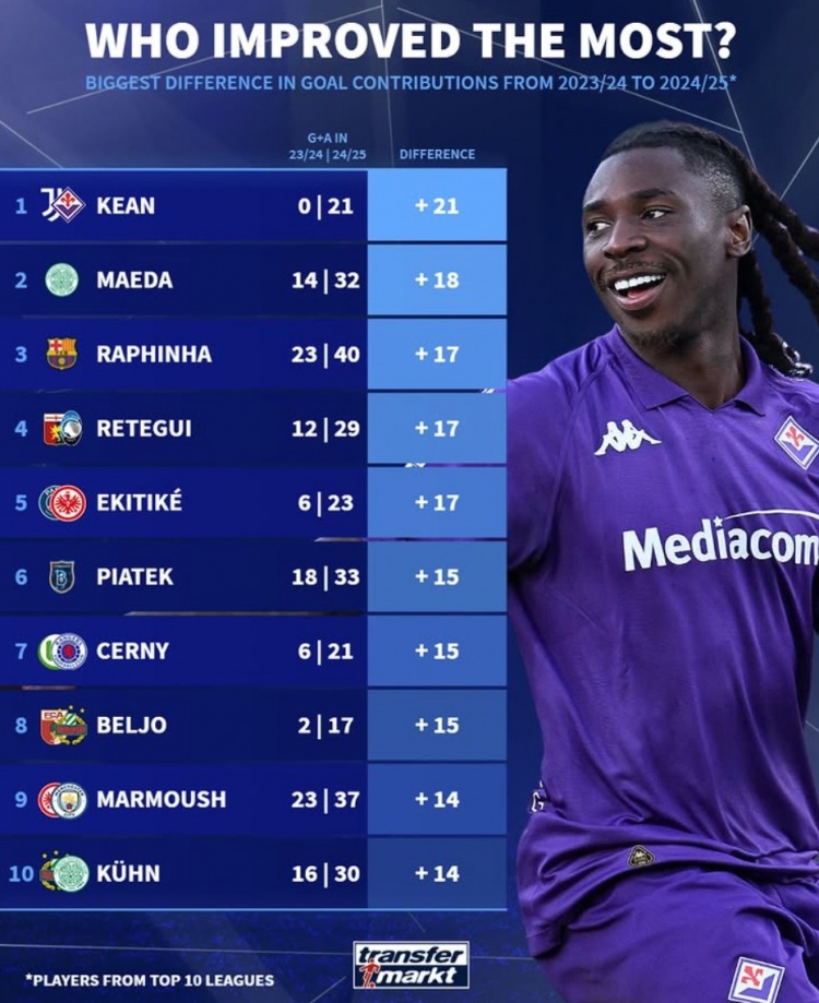 2月26日訊 《轉(zhuǎn)會(huì)市場》統(tǒng)計(jì)了歐洲前十聯(lián)賽球員相比上賽季的直接參與進(jìn)球提升情況,小基恩居首。
