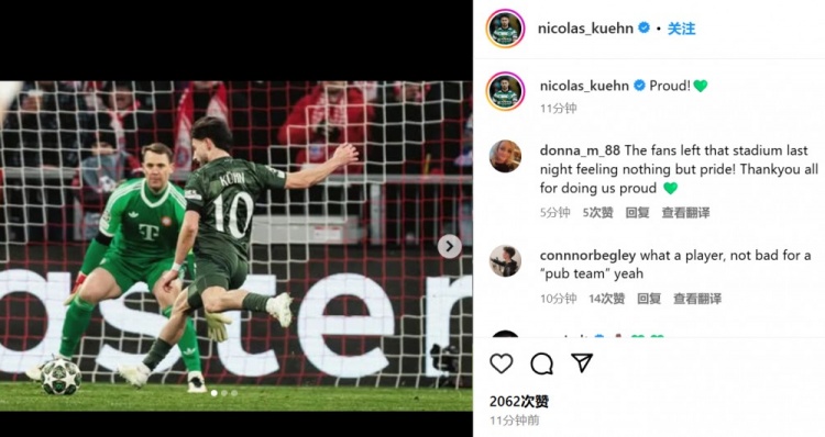 庫恩也在賽后通過社媒曬出自己?jiǎn)蔚睹鎸?duì)諾伊爾的射門瞬間照,并配文:“自豪!”