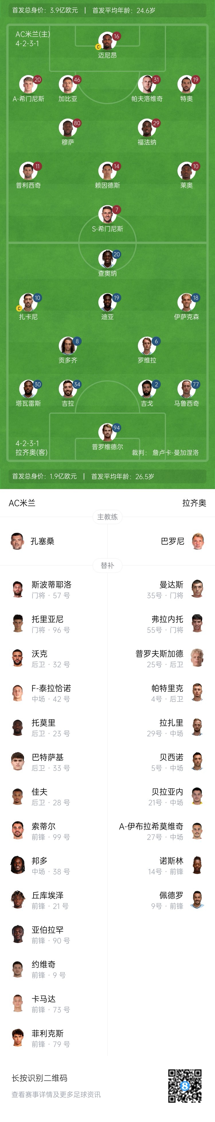 2025-03-03 06:00:28AC米蘭vs拉齊奧首發(fā):S-希門尼斯、萊奧、普利西奇先發(fā)