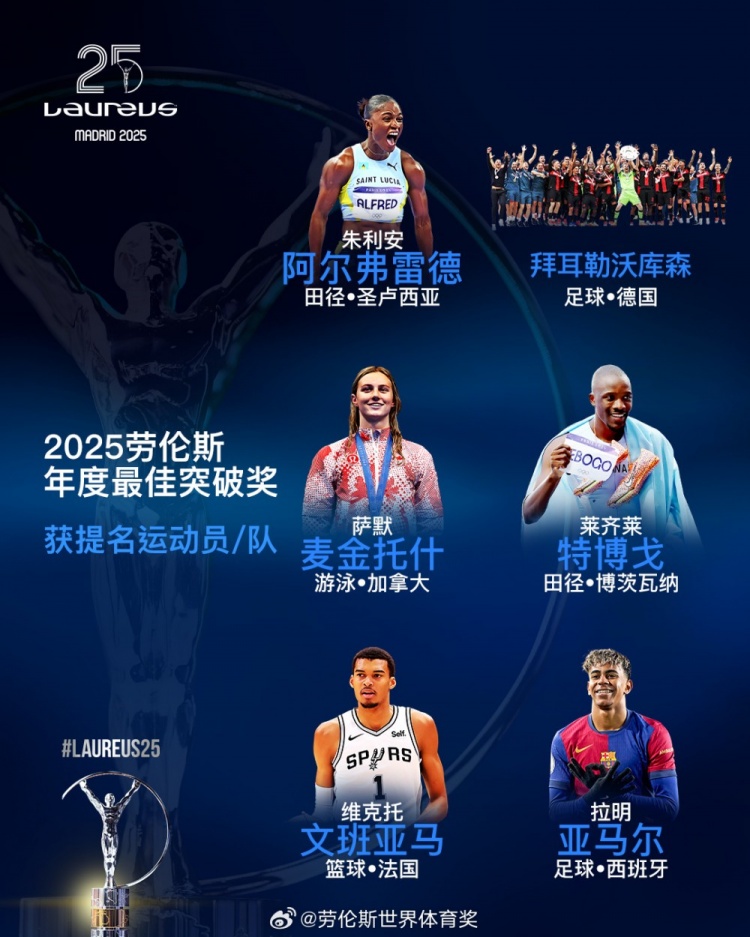 2025-03-04 00:04:55勞倫斯年度最佳突破獎(jiǎng)提名:勒沃庫森、亞馬爾、文班亞馬入圍