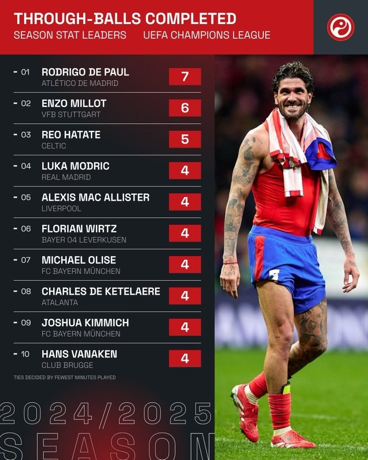 2025-03-04 06:00:28本賽季歐冠精準(zhǔn)直塞榜:德保羅居首,魔笛、麥卡、維爾茨在列