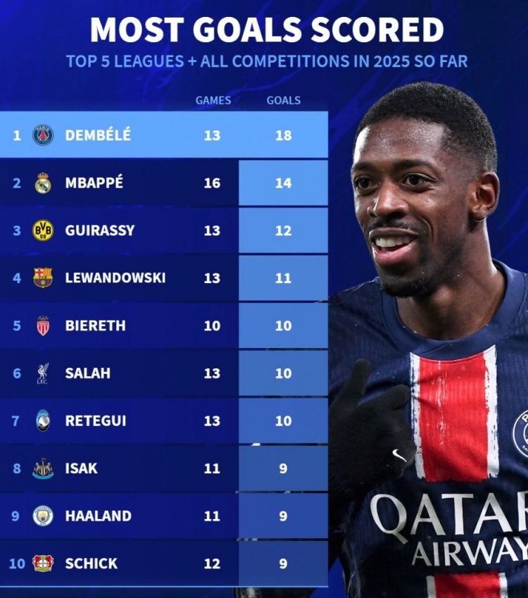 3月4日訊 《轉(zhuǎn)會市場》統(tǒng)計了2025年五大聯(lián)賽球員各項賽事進球情況,登貝萊居首。
