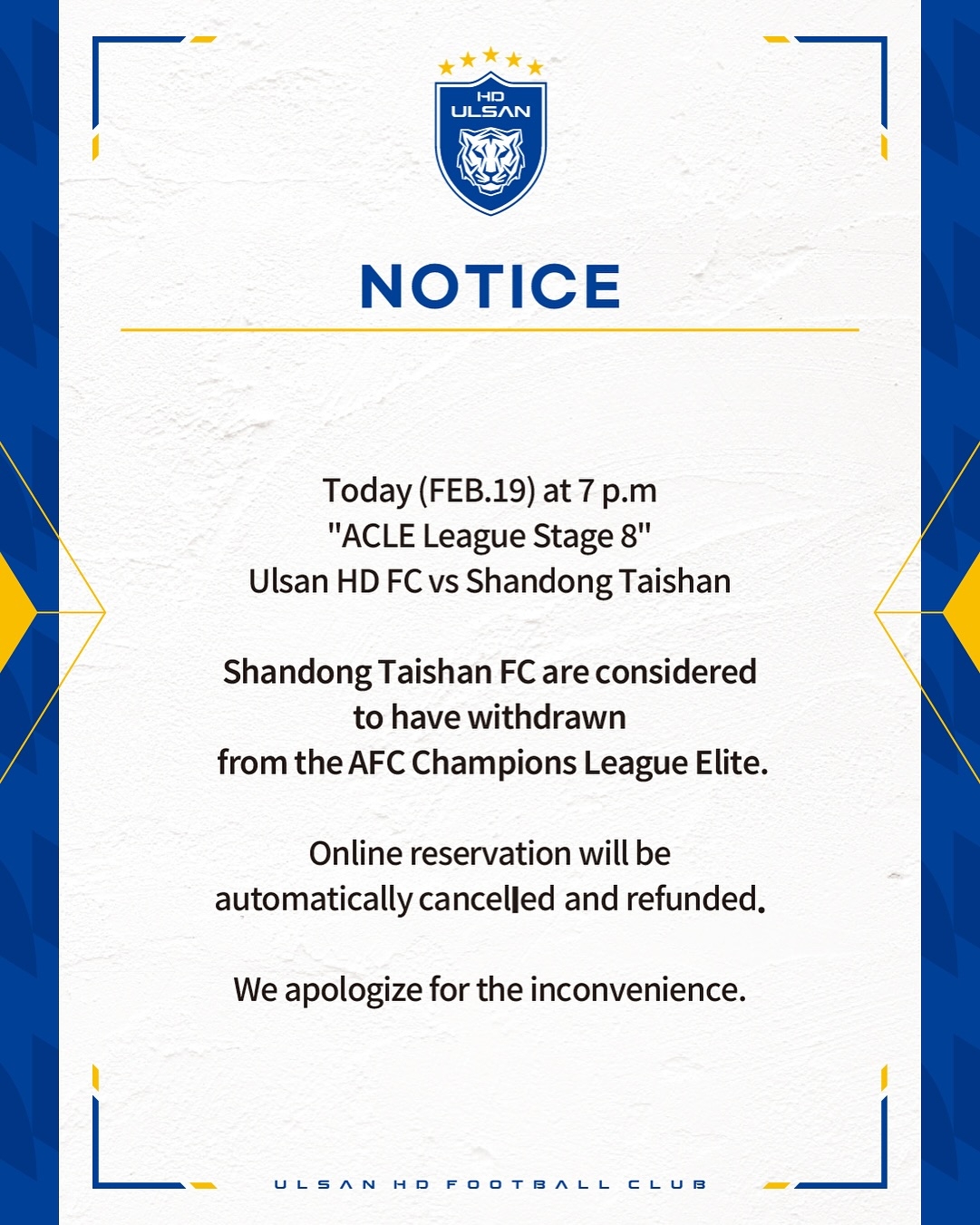 2025-02-19 19:48:28真不踢了!蔚山HD官方:由于泰山退賽,本場比賽取消并進行退票