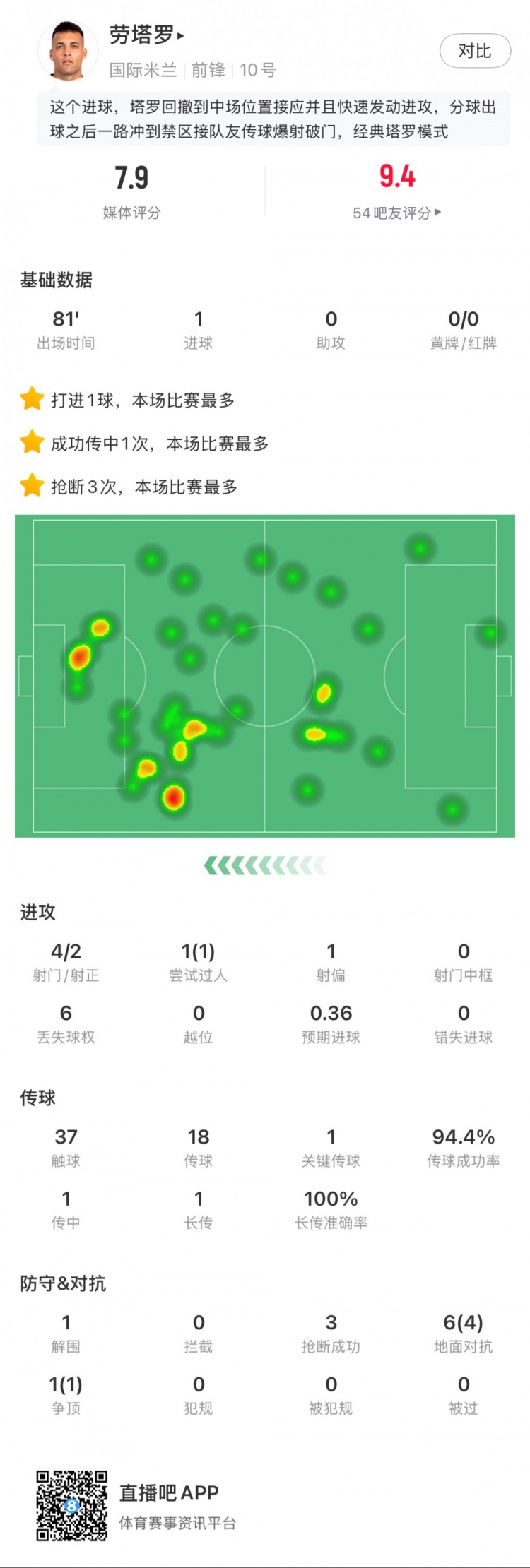 勞塔羅本場(chǎng)數(shù)據(jù):1粒進(jìn)球,4次射門2次射正,3次搶斷
