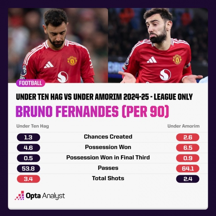 2025-03-07 00:02:16曼聯(lián)本賽季換帥后:B費(fèi)射門下降,創(chuàng)造機(jī)會(huì)&贏得球權(quán)等數(shù)據(jù)均提升