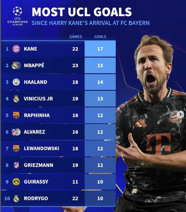 3月6日訊 拜仁在本輪歐冠3-0完勝勒沃庫(kù)森,凱恩頭頂腳踢梅開(kāi)二度,延續(xù)了加盟拜仁后的出色狀態(tài)。數(shù)據(jù)統(tǒng)計(jì)顯示,自凱恩加盟拜仁后,他的同期進(jìn)球領(lǐng)跑歐冠。