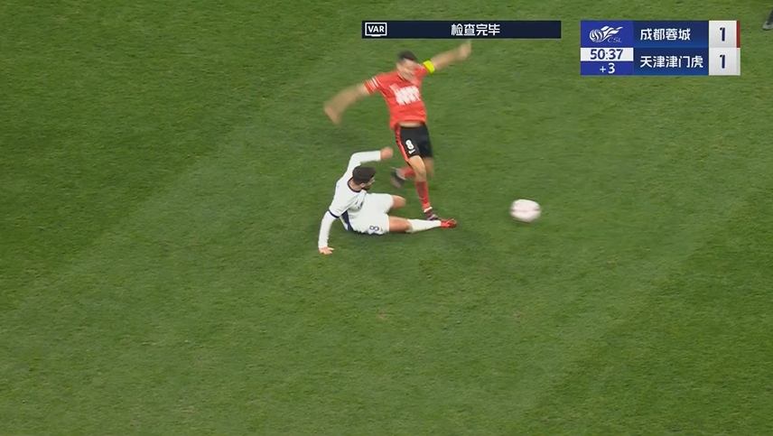 中超聯(lián)賽第2輪,成都蓉城VS天津津門虎,比賽第45+3分鐘,成都蓉城8號隊(duì)員在爭搶球時疑似踩踏天津津門虎8號隊(duì)員,裁判員未判罰犯規(guī),VAR介入,裁判員經(jīng)在場回看后,判罰成都蓉城8號隊(duì)員嚴(yán)重犯規(guī),并向其出示紅牌罰令出場。