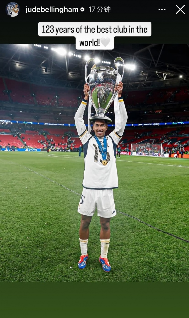 貝林厄姆曬出自己高舉歐冠獎杯的照片,并寫道:世界上最好的俱樂部123歲了!