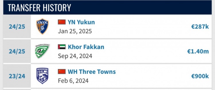 2024年年初,武漢三鎮(zhèn)以90萬歐元的轉(zhuǎn)會費引進了佩德羅-恩里克。由于在武漢三鎮(zhèn)表現(xiàn)不俗,2024年夏天,武漢三鎮(zhèn)以140萬歐元的價格將其賣給了阿聯(lián)酋的豪爾費坎。效力豪爾費坎半賽季后,佩德羅-恩里克重返中超聯(lián)賽,以28.7萬歐元的轉(zhuǎn)會費加盟升班馬云南玉昆。短短半個賽季,豪爾費坎在佩德羅-恩里克身上的投資凈虧損超過了百萬歐元。