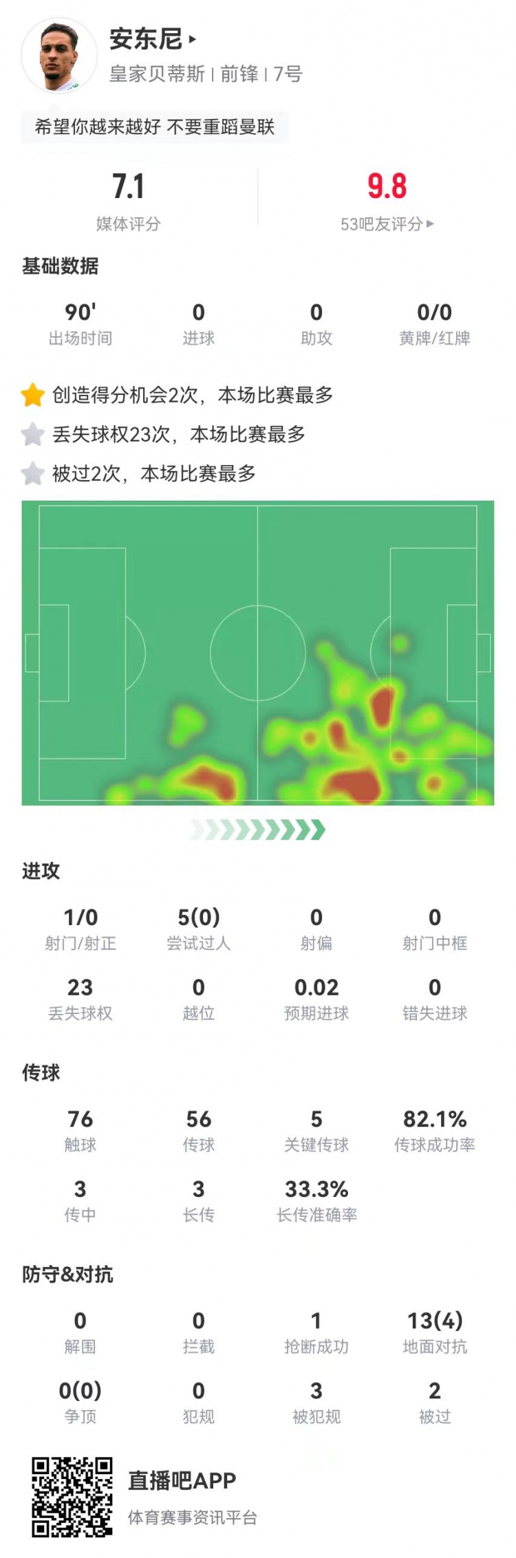 3月10日訊 貝蒂斯在本輪西甲1-0小勝拉斯帕爾馬斯,曼聯(lián)租將安東尼本場數(shù)據(jù)如下: