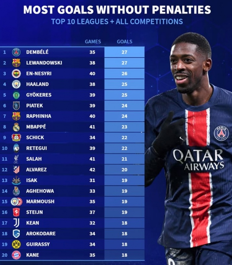 2025-03-11 00:04:14本賽季各項(xiàng)賽事無點(diǎn)球射手榜:登貝萊&萊萬27球,哈蘭德25球