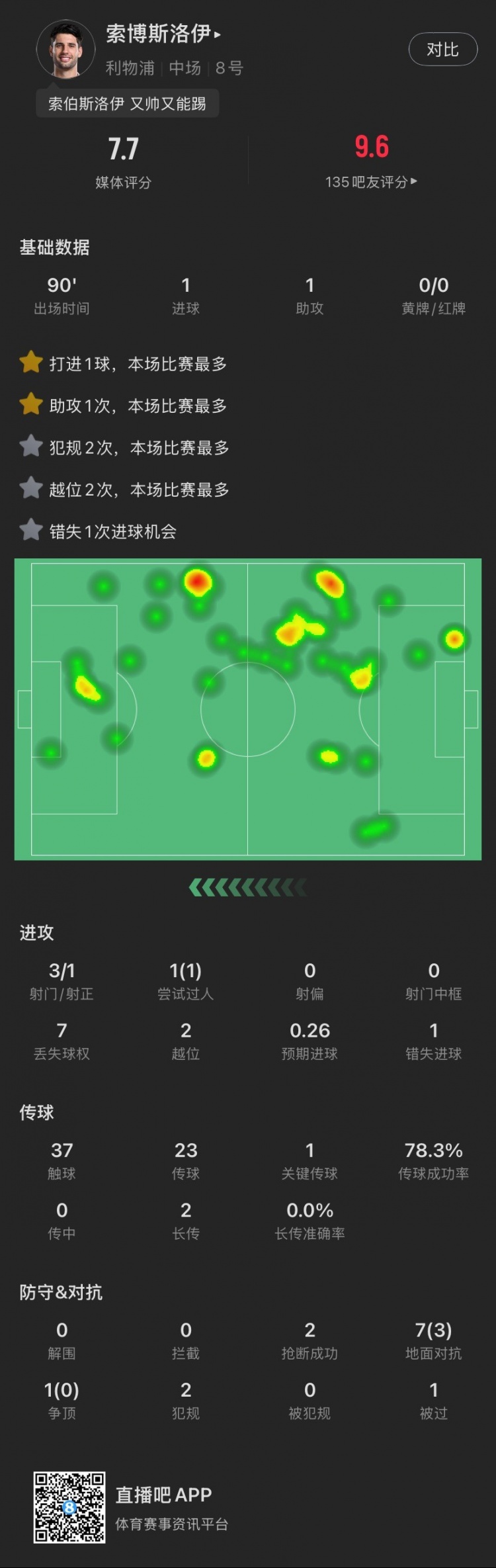 2025-02-24 12:03:05索博本場:傳射建功,越位2次全場最多,2搶斷,8次對抗成功3次