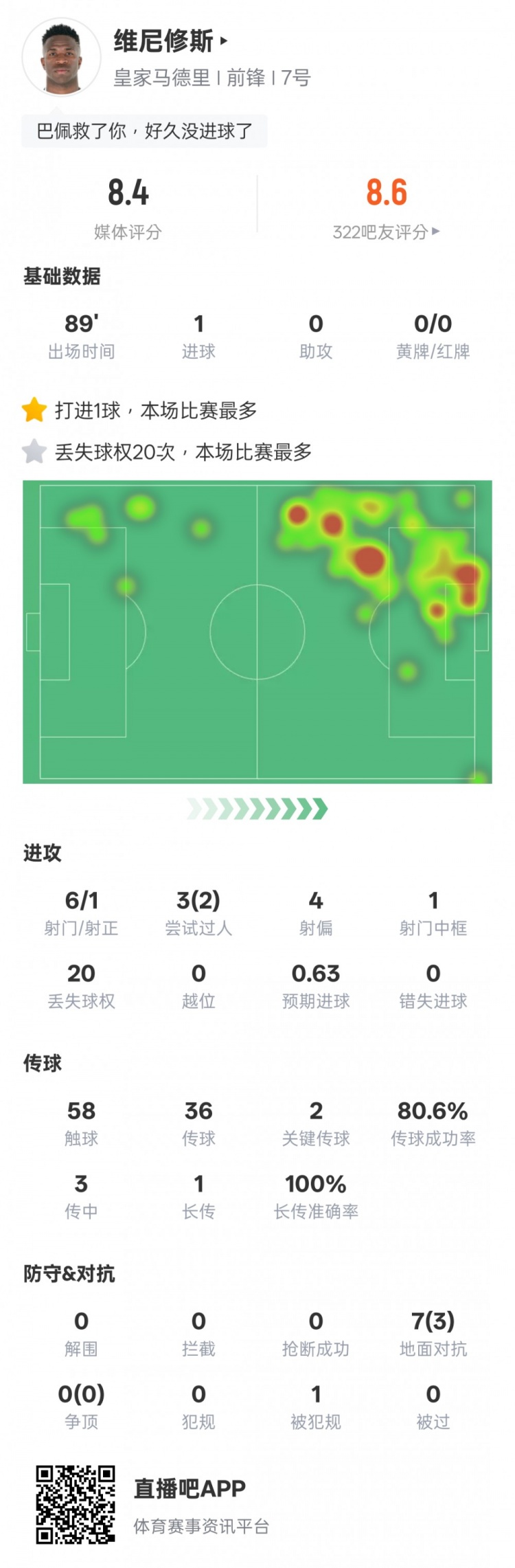 2025-02-24 12:03:15維尼修斯本場比賽數(shù)據(jù):1進(jìn)球&20次丟失球權(quán)全場最多,評分8.4