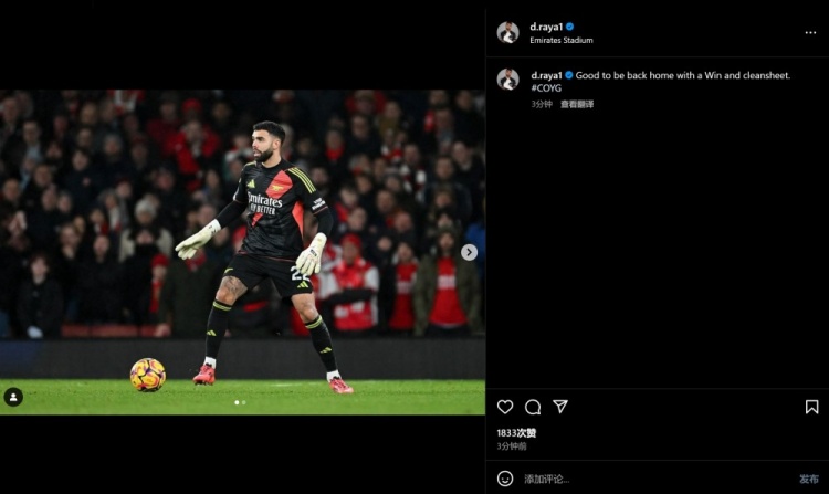 11月24日訊 英超第12輪比賽中,阿森納3-0完勝諾丁漢森林。賽后,拉亞更新了社媒,慶祝球隊(duì)取勝。