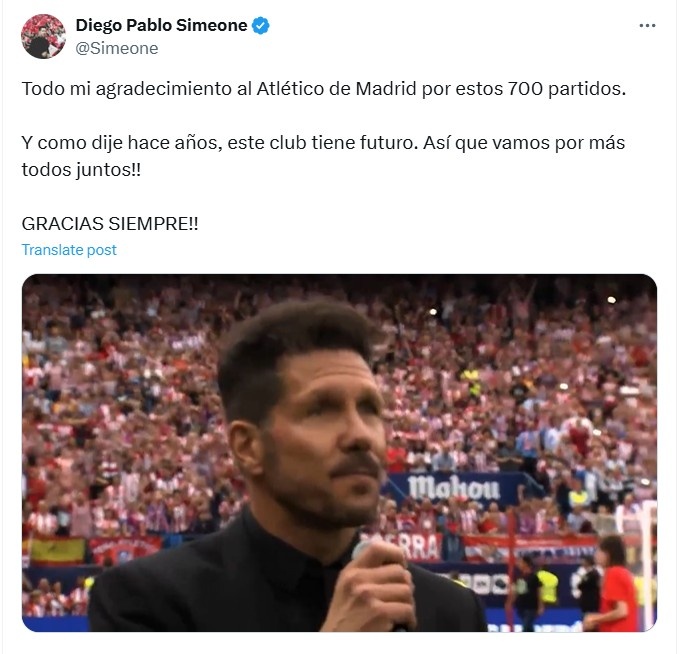 西蒙尼更新了社媒:“感謝能夠執(zhí)教馬競這700場比賽,就像我?guī)啄昵罢f的,這家俱樂部有著未來,所以讓我們一起去爭取更多!感謝你們!!”